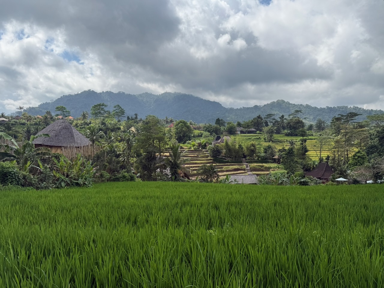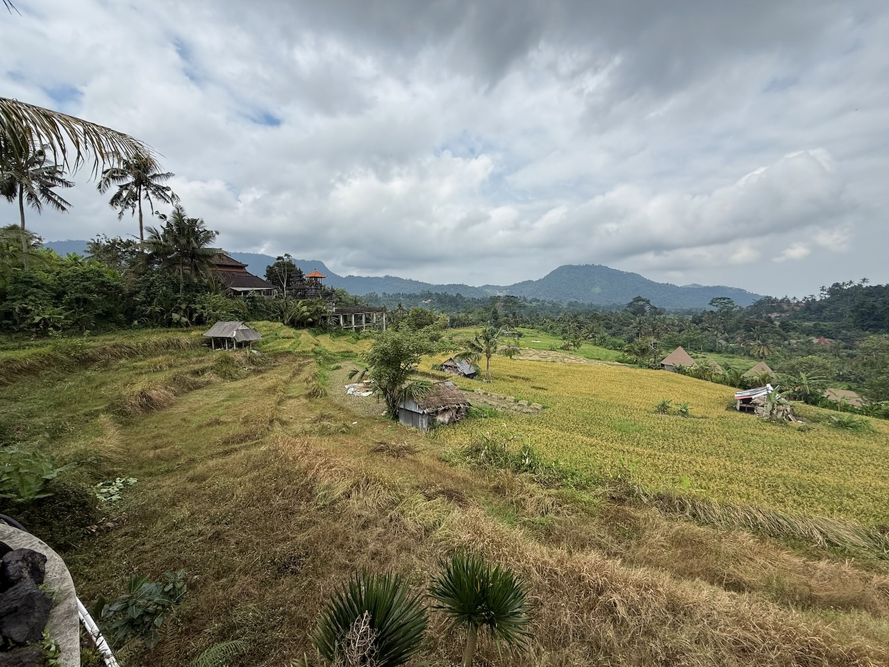 La vallée s’étend au pied du mont Agung, volcan culminant de l’île, dont la silhouette structure en permanence la perspective.